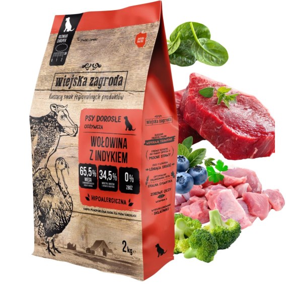 🐶 Wiejska Zagroda Wołowina z indykiem 2kg - duże chrupki M/L